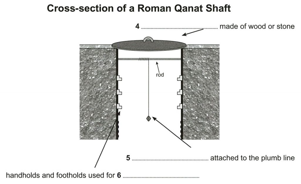 They later passed on their knowledge to the Romans, who also used the qanat method to construct water-supply tunnels for agriculture. Roma qanat tunnels were constructed with vertical shafts dug at intervals of between 30 and 60 meters. The shafts were equipped with handholds and footholds to help those climbing in and out of them and were covered with a wooden or stone lid. To ensure that the shafts were vertical, Romans hung a plumb line from a rod placed across the top of each shaft and made sure that the weight at the end of it hung in the center of the shaft. Plumb lines were also used to measure the depth of the shaft and to determine the slope of the tunnel. The 5.6-kilometer-long Claudius tunnel, built in 41 CE to drain the Fucine Lake in central Italy, had shafts that were up to 122 meters deep, took 11 years to build and involved approximately 30,000 workers.