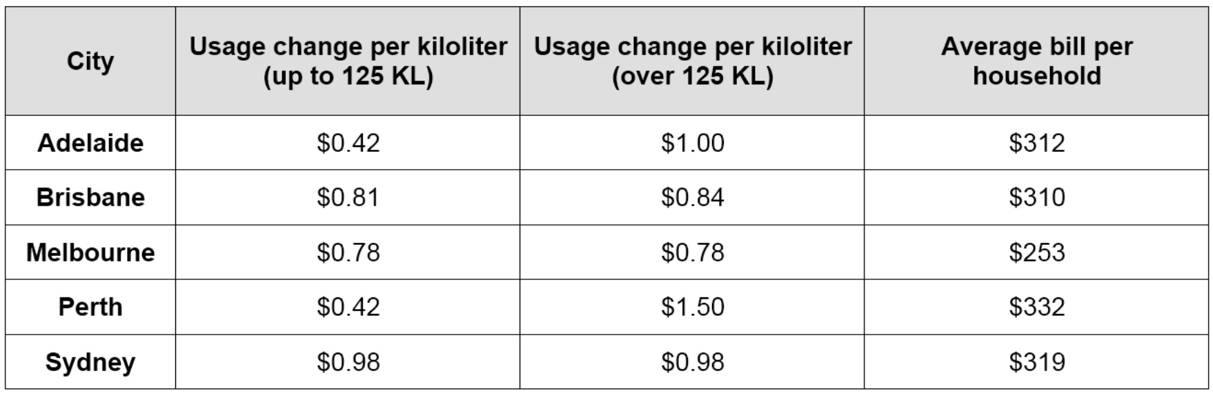 The table shows the cost of water in 5 cities in Australia