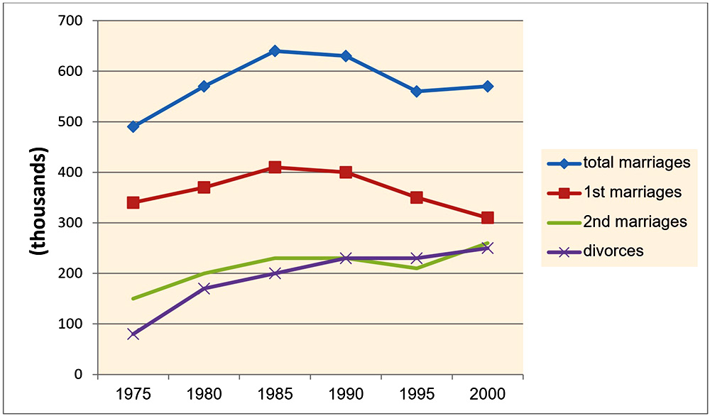 Overall, while the number of marriages increased over the period, the number of first marriages declined. The figure for divorces rose steadily.