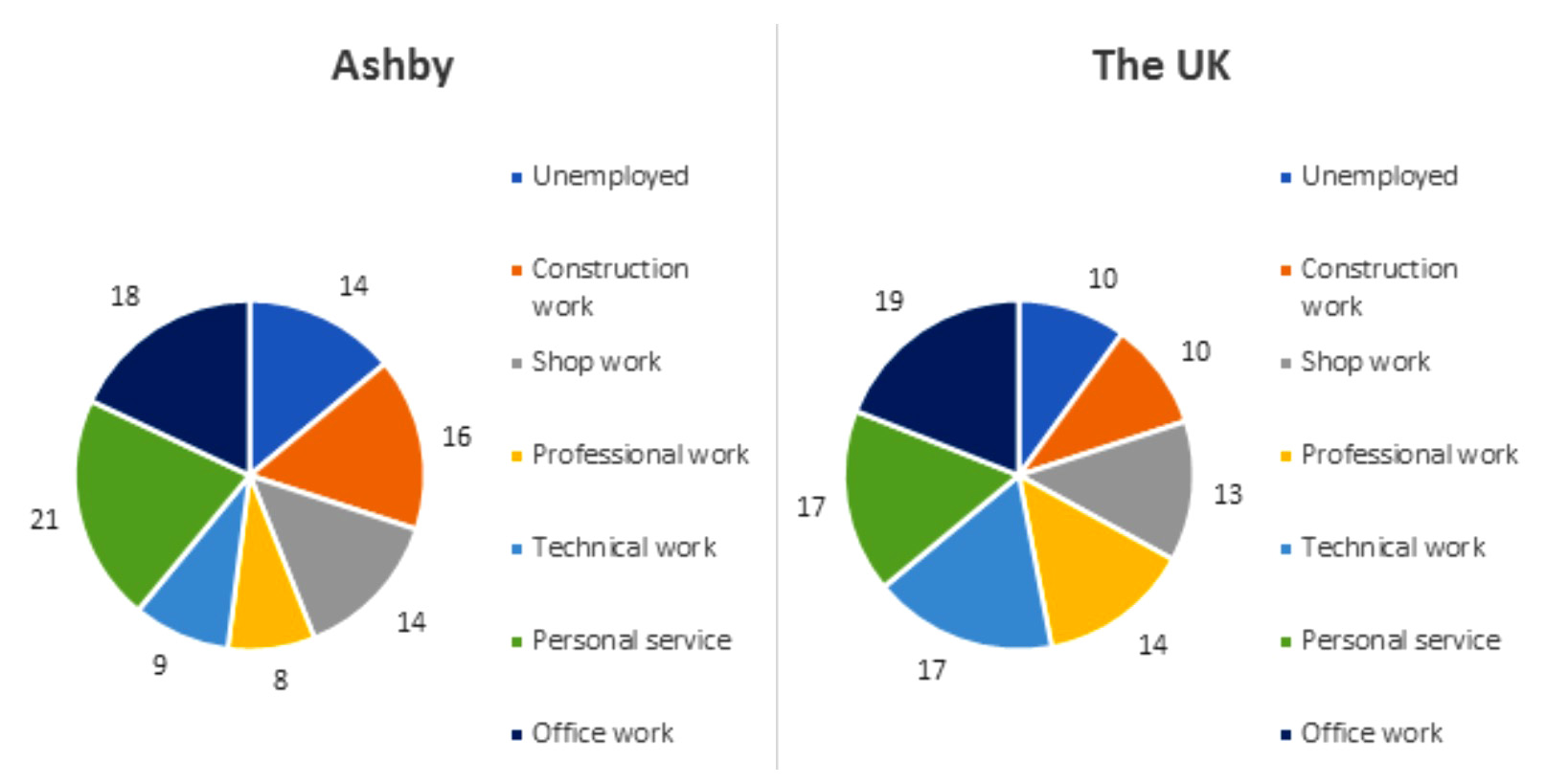 Overall, the national unemployment rate was lower than the rate in Ashby. Moreover, while British people generally preferred office work, personal service was the most popular profession in Ashby.