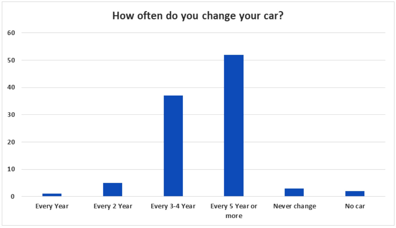 The first bar chart shows that approximately 52% of people in this particular country changed cars after 5 or more years, and roughly 37% changed cars after 3-4 years. About 5% of people changed cars every two years, 1% of people changed every year, and approximately 3% of people never changed. Furthermore, about 2% of people didn’t even own a car.