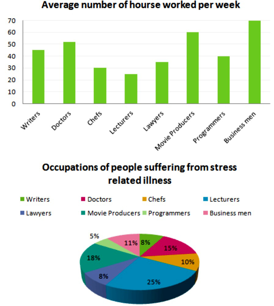 Two graphs give different information related to eight professional groups. The bar chart indicates the number of weekly work hours done by the groups while the pie graph illustrates the percentages of people suffering from stress related illness in the different professions given.