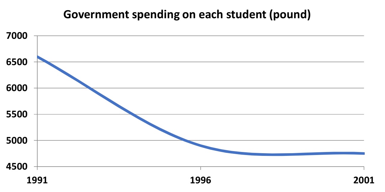 Despite the overall increase in student numbers, government budgets allocated to support those students fell substantially from 6500 pounds to around 4700 pounds, a decrease of 1200 pounds in only 5 years. After that, the figure experienced almost no change until the end of the period.