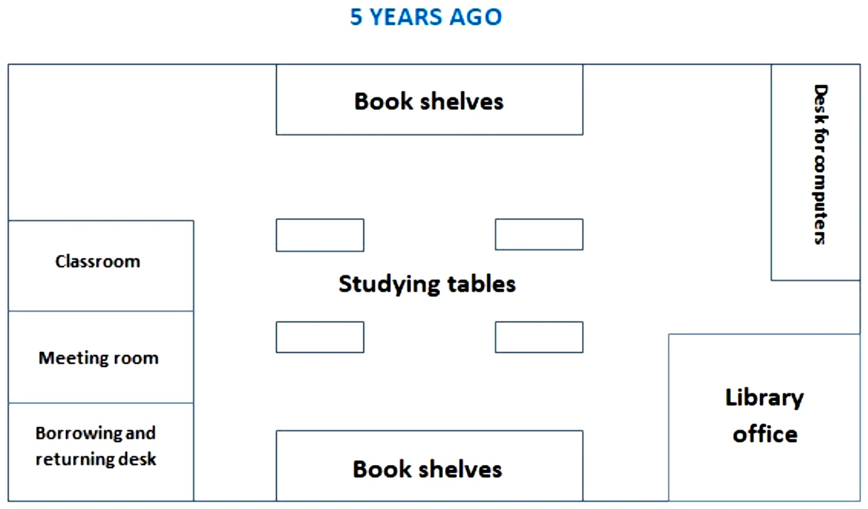 The diagrams illustrate how the layout of a school library changed over a period of five years.