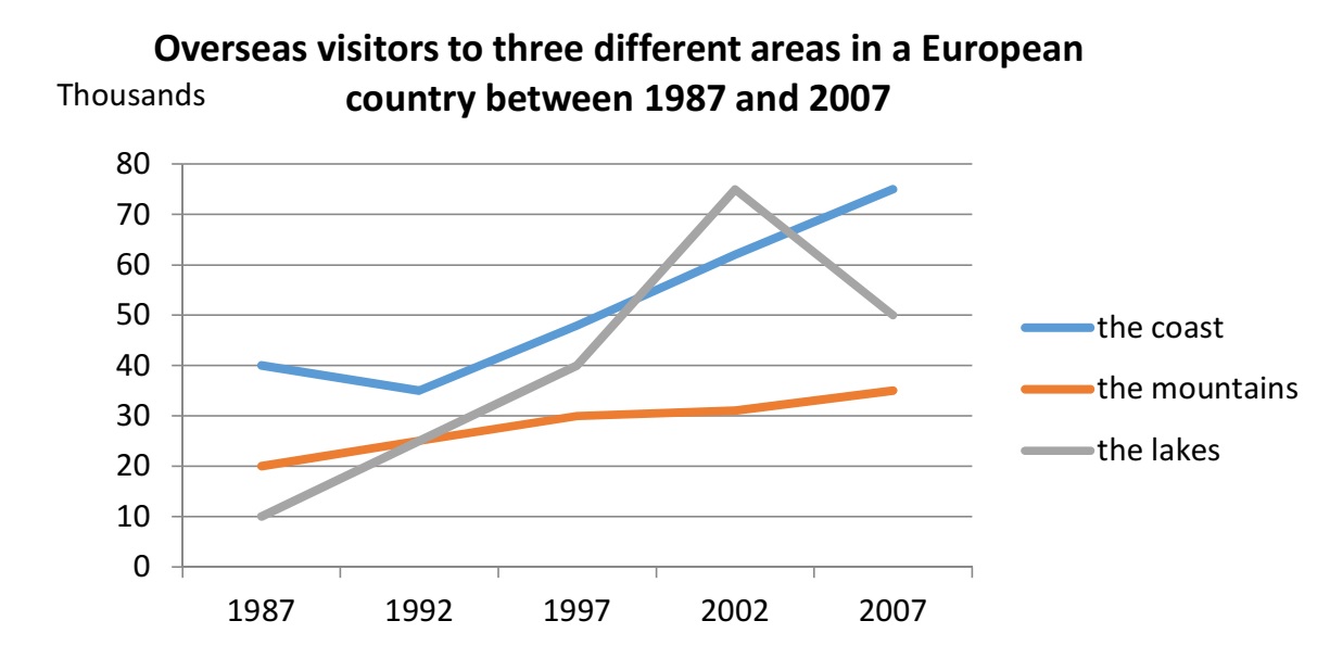 The graph below shows the number of overseas visitors to three different areas in a European country between 1987 and 2007.