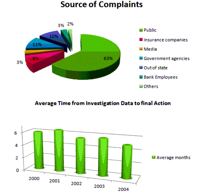 In general, by far the highest number of complaints against the bank of America originated from the public. The bar graph shows the average time period between investigation and action is around 5 months. 63% of all complaints against the bank of America are lodged by the public. Of the remaining 37% of complaints, the figures can be grouped into percentages between 11 and 8%, which are made up of government agencies, out-of-state agencies, and insurance companies. Then interestingly, media and bank employee made up and equal figure, 3% in the chart.