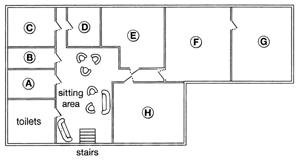 The cloakroom where you should leave coats, umbrella and any large bags, is on the left hand side of the sitting area. It’s through the last door before you come to the corridor. (Q20)