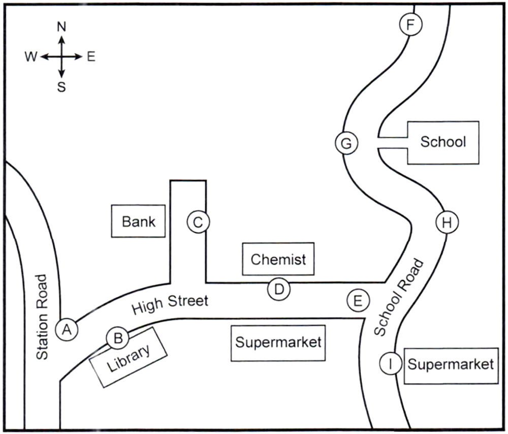 OK, so this slide shows a map of the central area of Granford, with the High Street in the middle and School Road on the right. Now, we already have a set of traffic lights in the High Street at the junction with Station Road, but we’re planning to have another set at the other end, at the School Road junction (Q14), to regulate the flow or traffic along the High Street.
