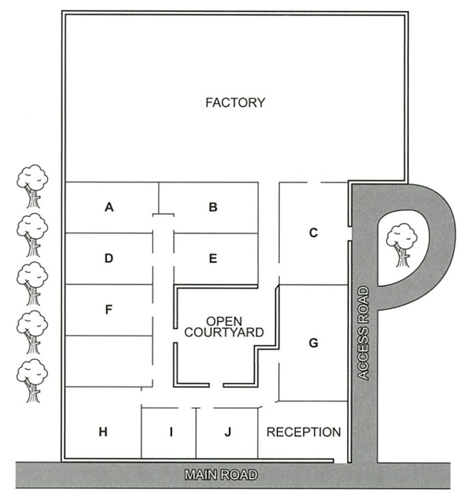 The factory is the very big room on the far side of the site. Next to it is the warehouse, which can be accessed by lorries going up the road to the turning area at the end. You can get to the warehouse by crossing to the far side of the courtyard, and then the door is on your right (Q16).