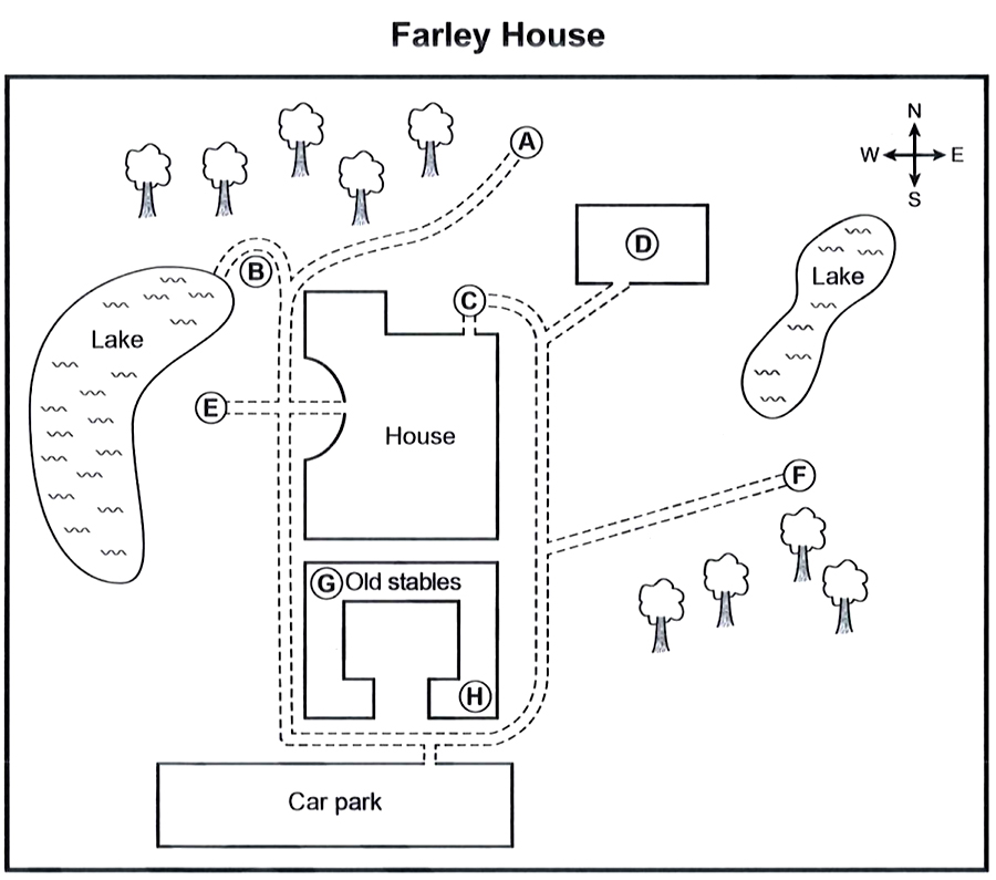 Now on Sunday, we’ll be taking our visitors to Farley House. You may not all be familiar with it, so here’s a map to help you. You can see the car park at the bottom of the map. There’s an excellent farm shop in the grounds where our visitors can buy local produce – it’s in the old stables, which is the first building you come to. Q16. They’re built round a courtyard, and the shop’s in the far corner on the left. There’s also a small café on the right as you go in.
