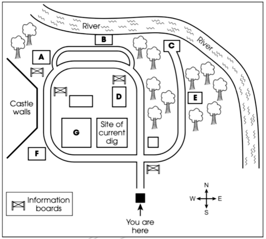 When you enter the site, please make sure you keep to the paths at all times. There are a few other things, the highlights of the site if you like, that I want to mention. Take a look at the map. Our present location is marked at the bottom. This year, we’ve identified the foundations of an ancient bridge, and it’s really exciting today because a team of divers are in the river searching for lost objects. To reach the bridge, take the main path ahead of you, go straight on, and keep going till the path bends to the left. You’ll see a smaller track leading off to the right. Follow that to take you to the river, where the divers are. You might be interested to see the rubbish pit. This is very near the castle walls in the north-west corner of the site. It actually dates to the time of the castle and not the ancient village. We found oyster shells and fish bones, and we assumed they were thrown from the castle kitchen above. One area we excavated in the first summer uncovered the site of a meeting hall. We knew it was an important building because it had two rows of post holes, deep enough to support a large roof. It is the largest structure in the central area of the site next to the current excavation area. Last year we discovered a fish pond in the ancient village. Normally these were beside a river. The pond here is further away, but it’s possible the river has moved slightly. Anyway, to get there from here, you turn right at the first information board you come to and follow the path into the trees. Before you come out of the trees, you’ll see it on your right. If you reach the river, you’ve gone too far. So, does anyone have…