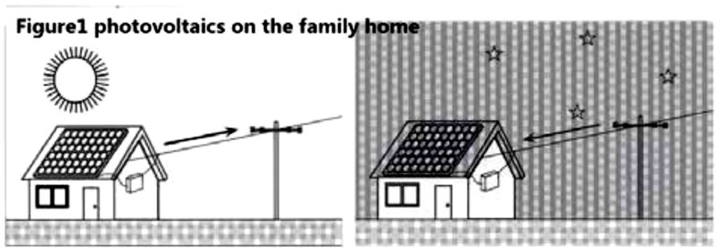 Residential use of photovoltaics – by day excess power is sent to the grid, and by night power is supplied to the home.