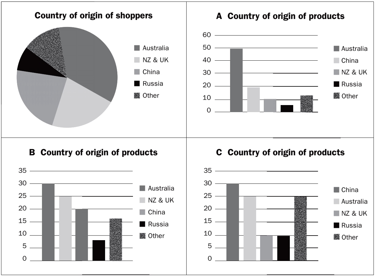 Which chart below – A, B, or C – best describes the relationship between shoppers at one Sydney supermarket, and what research suggests that same supermarket should sell?