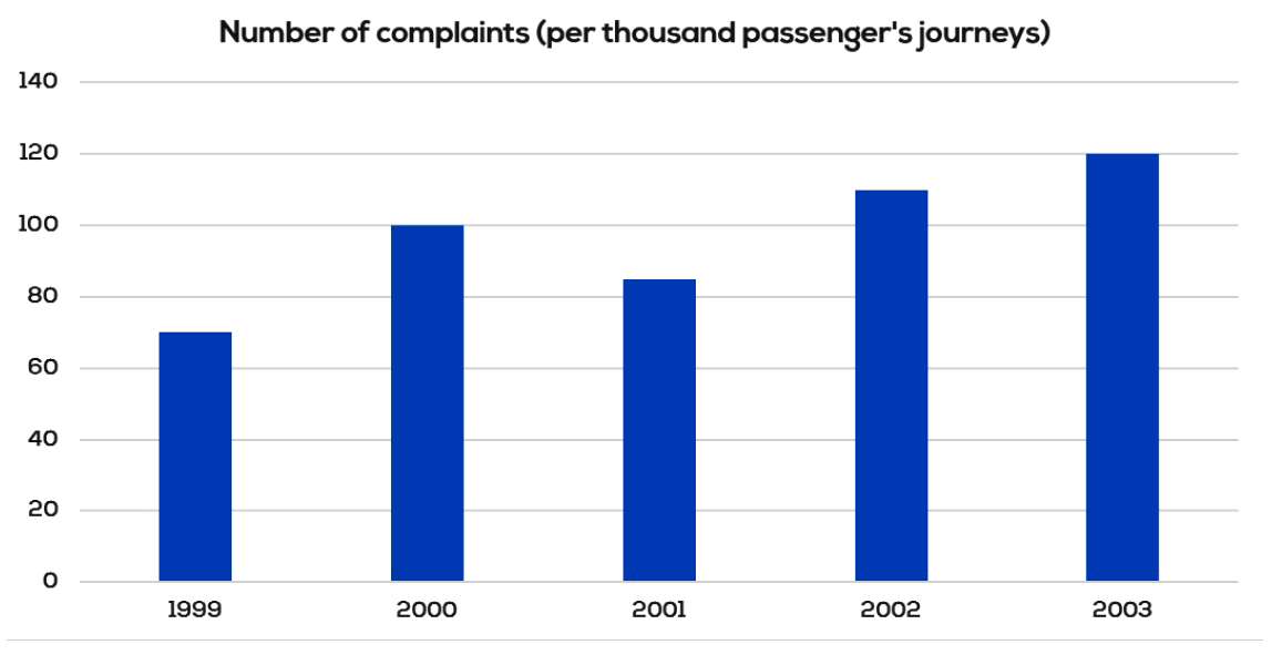 Starting at approximately 7% of total passengers in 1999, the number of complaints made by passengers rose significantly before experiencing a slight decline to just over 8% in 2001. This figure then grew considerably two years later, with about 12% of passengers complaining in the last year.