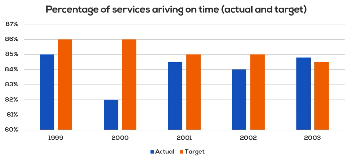 In 1999, the company’s target of buses arriving on time stood at 86%, which was 1% higher than what was actually achieved. Although the target remained unchanged one year later, the percentage of on-time arrivals dropped by nearly 3%. By 2003, this company had reduced its target of on-time arrivals to just over 84%, while the actual figure had witnessed considerable growth to about 85%.
