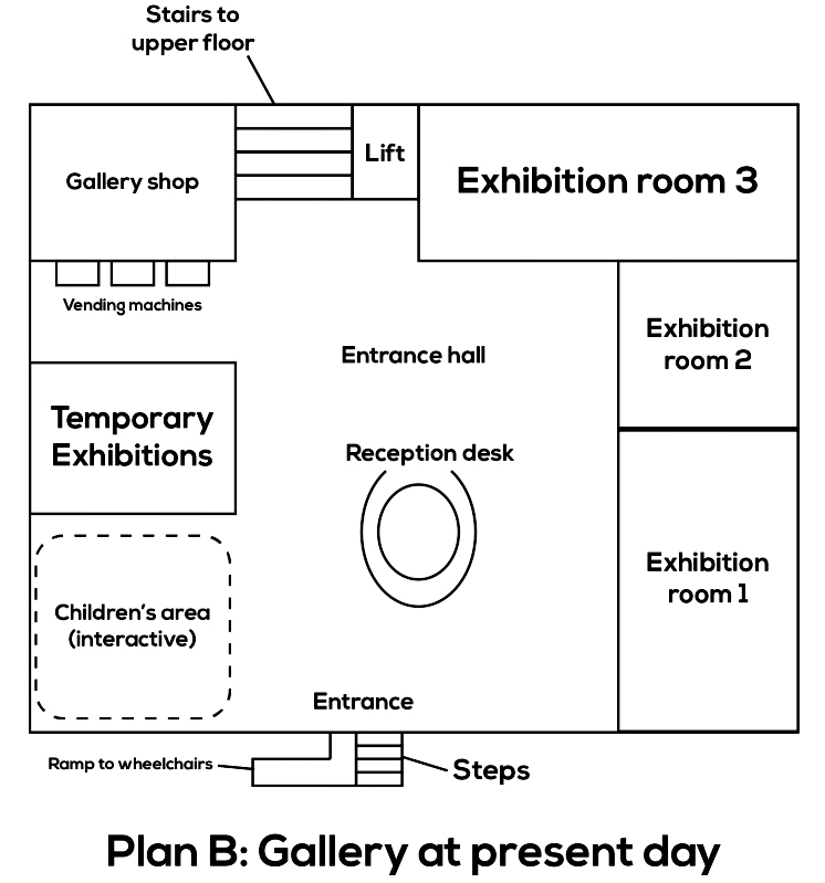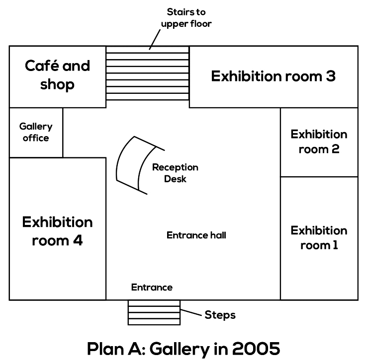 Plan A below shows the ground floor of a particular art gallery in 2005. Plan B shows the same area in the present day.