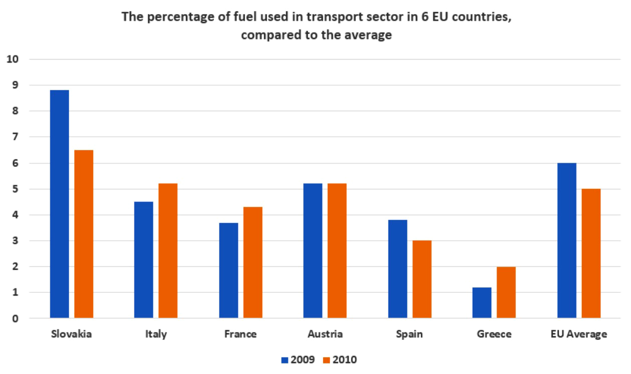 In 2010, the figure for Austria remained unchanged, at just over 5%, and slightly less fuel was used for transportation in Slovakia and Greece as illustrated by decreases to just over 6% and 2% respectively. In contrast, Italy, France, and Greece all experienced increases of roughly 1% in fuel consumption.