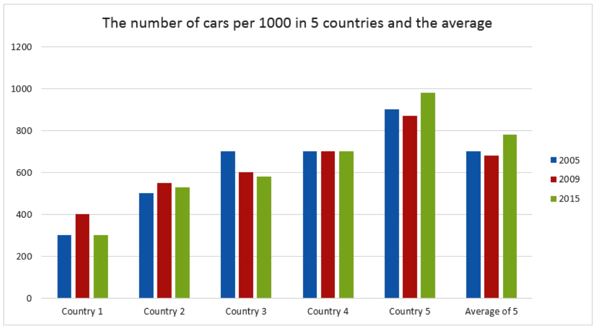 The bar chart shows the number of cars per 1000 people in 5 European countries in 3 years and compares with the European average.