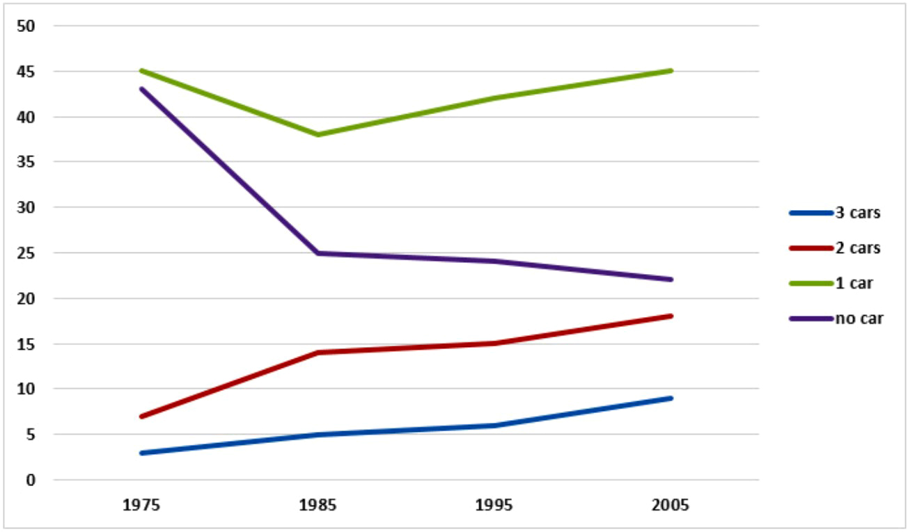 Over the next 20 years, the percentage of those with one car gradually rose back up to 45% whereas the percentage of those with no car continued to decline to about 22%. On the other hand, the proportion of people having 2 or 3 cars continued to rise over the following 20 years to 19% and 9% respectively.