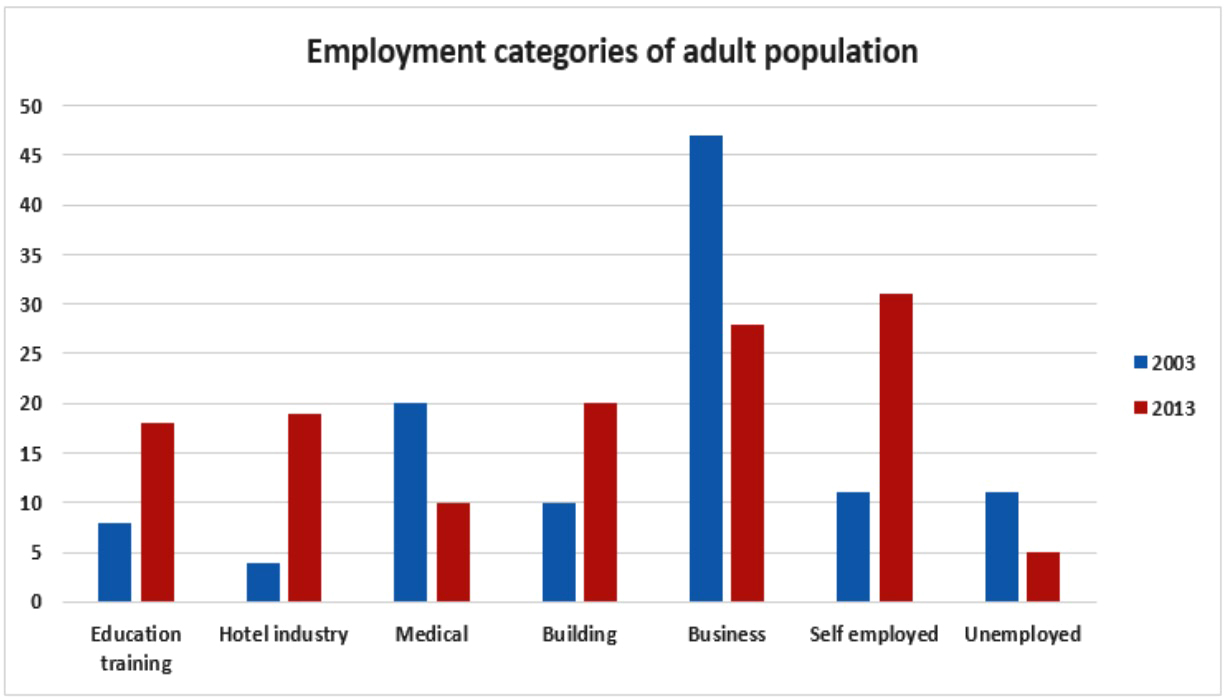 In general, it can be seen that there were increases in the percentages of people working in education training, the hotel industry, the building industry, and the self-employment sector, while the medical, and business sectors saw decreases over this ten-year period. The unemployment rate also significantly dropped during this time.