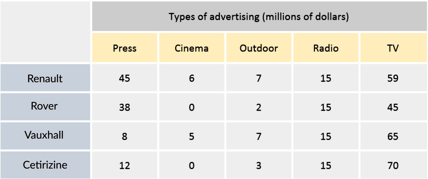 In 2002, Cetirizine allocated $70 million for TV advertisements, while the figure for Vauxhall was slightly lower, at $65 million. Meanwhile, $59 million was spent on TV commercials by Renault, and only $45 million by Rover. In terms of press advertising, the amount of money spent by Renault was again largest, at $45 million, slightly higher than that of Rover, at $38 million. In contrast, Vauxhall and Cetirizine only spent $8 million and $12 million on press advertising, respectively.