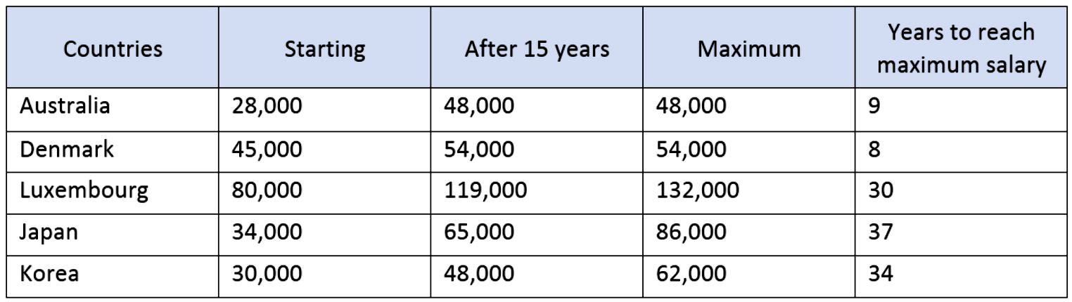 However, teachers with at least 15 years of experience in Luxembourg earned up to $119,000 a year, while teachers in Denmark and Japan with the same level of experience only made salaries of $54,000 and $65,000 respectively. Meanwhile, Australian and Korean teachers with at least 15 years’ experience were paid the lowest salaries, at $48,000 a year. Also worth noting is that it only took teachers in Australia and Denmark less than 10 years to receive their maximum salary, while teachers in the other countries had to wait for at least 30 years.