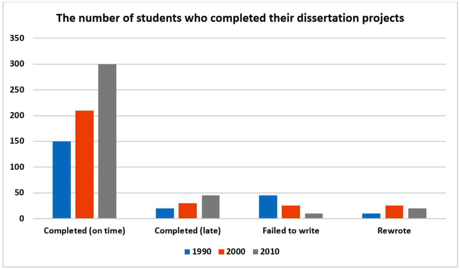 20 years later, the number of dissertations that were completed on time had doubled, to 300, while the number of late submissions had more than doubled, to just under 50. Significantly fewer students failed to write their dissertation, as illustrated by an approximate threefold decline, and the figures for students that rewrote their dissertations rose, to roughly 25 by 2010.