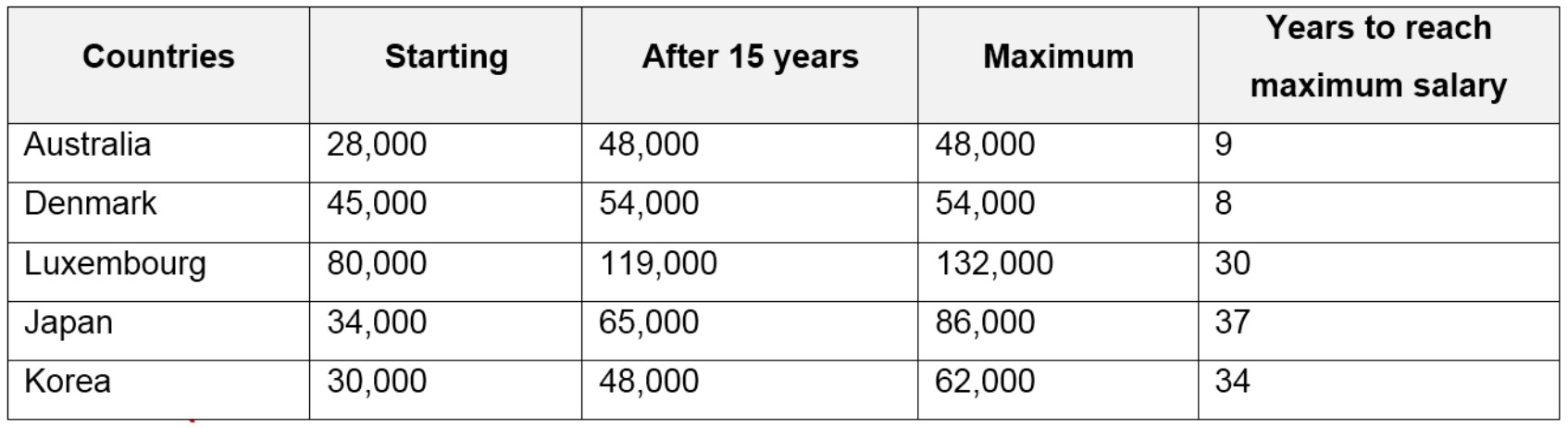 Korean teachers with at least 15 years’ experience were paid the lowest salaries, at $48,000 a year. Also worth noting is that it only took teachers in Australia and Denmark