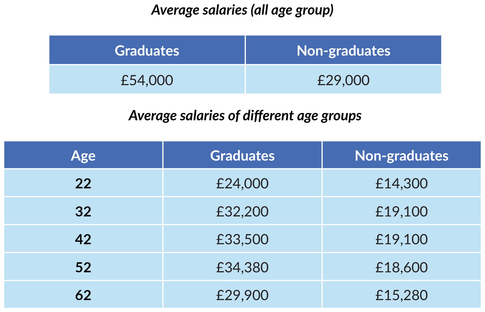 The tables show the average salaries of graduates and non-graduates in the UK in 2010