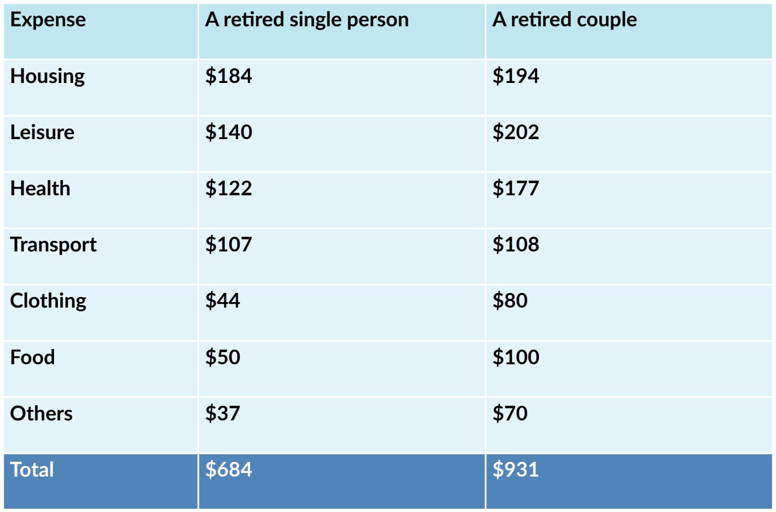 The table compares the budgets needed for retired singles and couples to live a