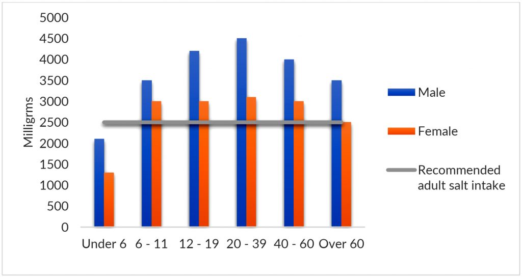 Regarding females, those aged under 6 consumed approximately 1200mg, while those aged between 6 and 60 consumed nearly three times that figure, at around 3000 mg. Women over 60 were the only group that consumed the recommended amount of salt, at 2500 mg.