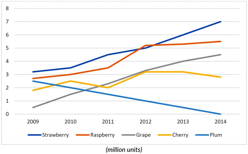 Starting at 3.2 million units in 2009, the sales of strawberry quickly increased and reached a peak of 7 million at the end of the period. Similarly, the figures for raspberry and grape witnessed the same pattern in which their sales grew considerably and stood at 5.5 million and 4.5 million respectively in 2014.