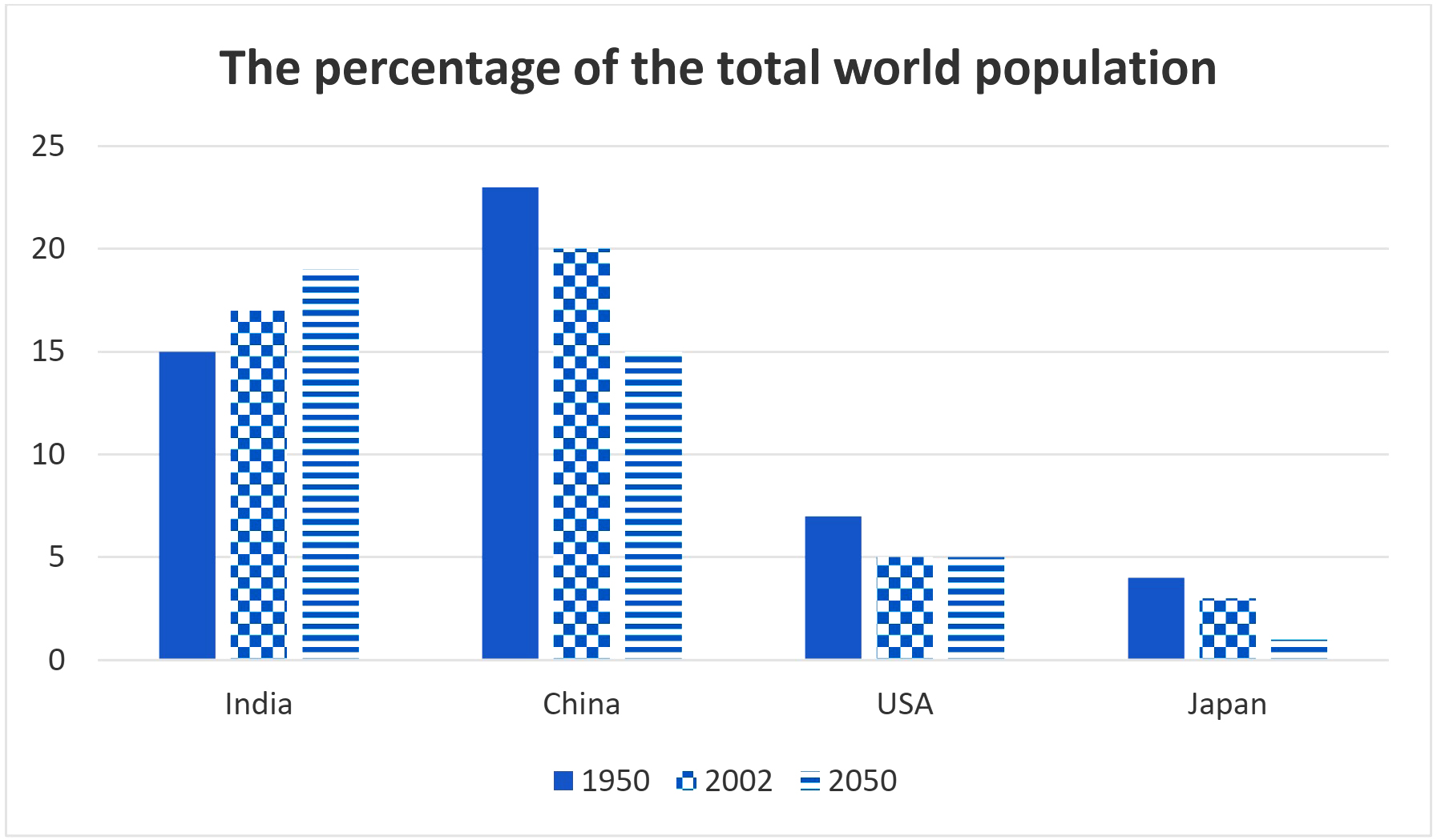 The bar chart illustrates the proportion of the total world population in four countries (India, China, USA and Japan) in 1950, 2002, and predicted figures for 2050.