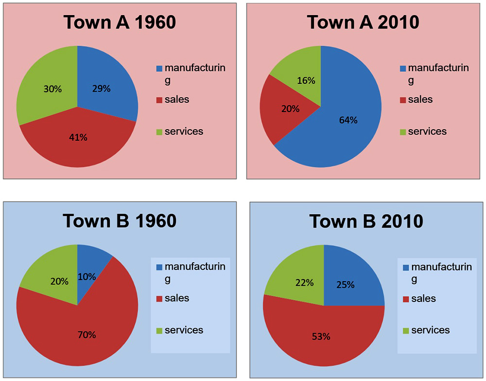 In 1960, the figure for workers in manufacturing was 29% in Town A, almost three times higher than the figure in Town B. However, by 2010 the proportion of people in manufacturing had risen in Towns A and B to 64% and 25%, respectively.