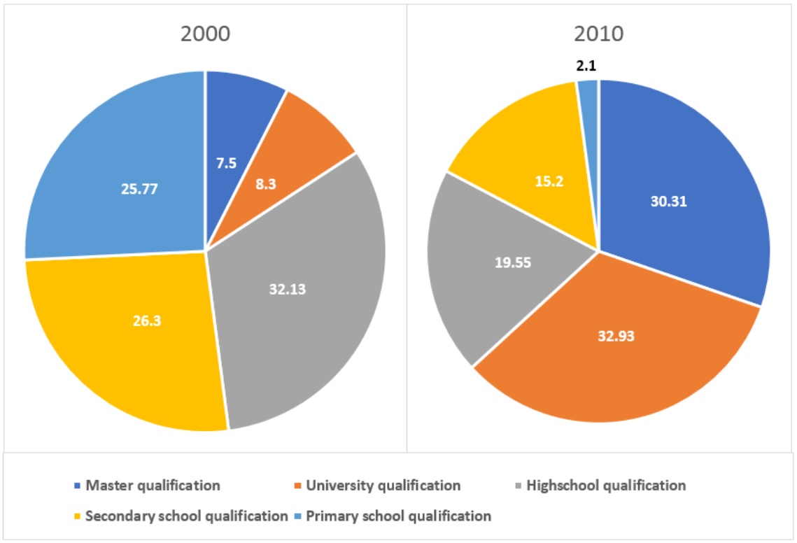 According to the pie charts, in 2000, almost one-third of Singapore’s population finished high school. The figures for those who only finished primary and secondary school were quite high, at approximately 26% each, compared to less than 10% of Singaporeans who had gained a bachelor or master’s degree. However, the level of education people were attaining had increased over the ten year period, with nearly two-thirds of the population obtaining a university degree, and only 2.1% leaving after primary school.