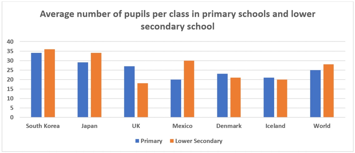 With regards to lower secondary school classes, South Korea, Japan, and Mexico, all had higher than world average class sizes, with South Korea again having the largest classes, at an average of 36 students per class. The UK, Denmark, and Iceland, all had smaller than world average classes, with 18, 21, and 20 students per class respectively.