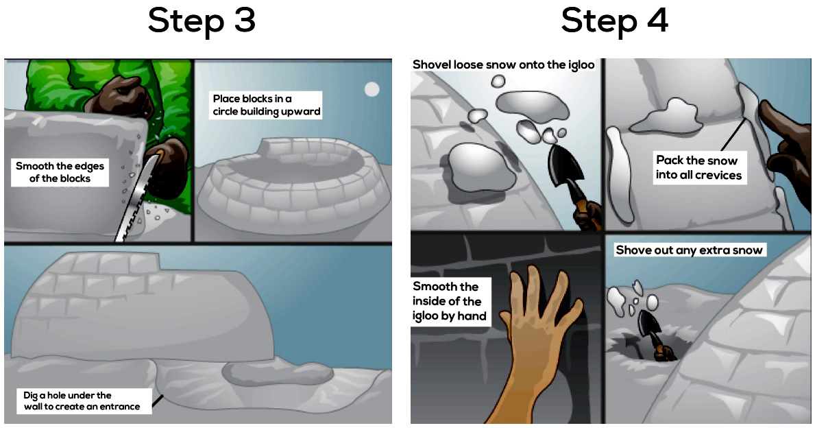As can be seen from the process, after a surface of hard-packed snow is found, a snow saw is used to cut large blocks to the appropriate size to build the base. The edges of the blocks are then smoothed with the saw and are placed in a circle, and a hole is dug under the wall to make an entrance. Next, a slightly over-sized block is precisely shaped and placed on the top of the igloo.