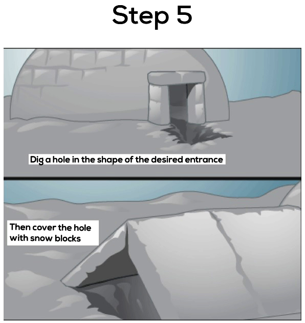 There are five main stages in this process, starting with finding an area covered by hardpacked snow and culminating in covering the entrance hole with snow blocks.