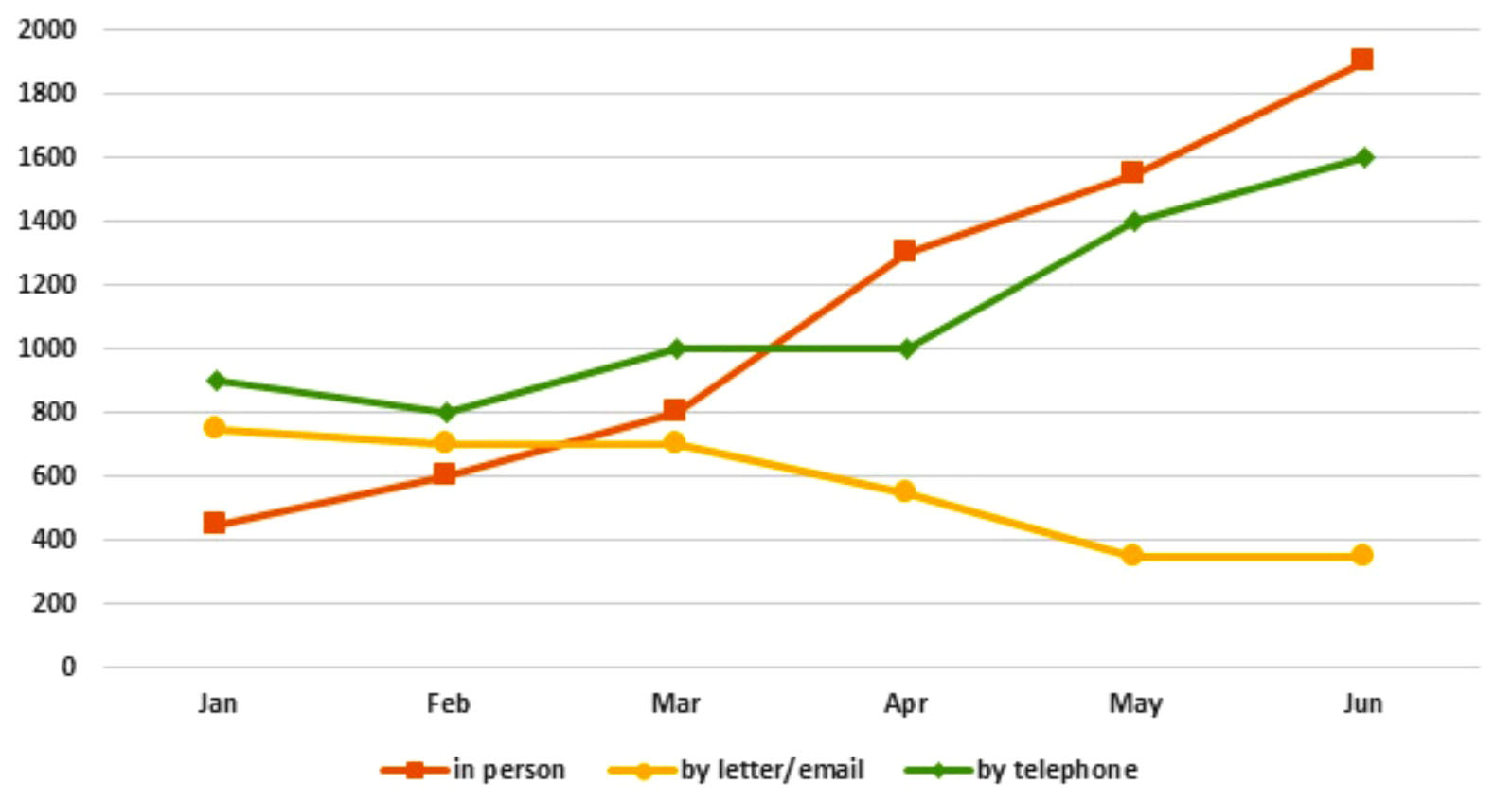 In January, the Tourist Information Office received 900 telephone enquiries, while just under 800 letters and emails were received. Not many tourists chose to ask for information in person, with just over 400 queries. Over the next three months, the telephone still remained the most popular method of enquiry, at approximately 1000 queries.