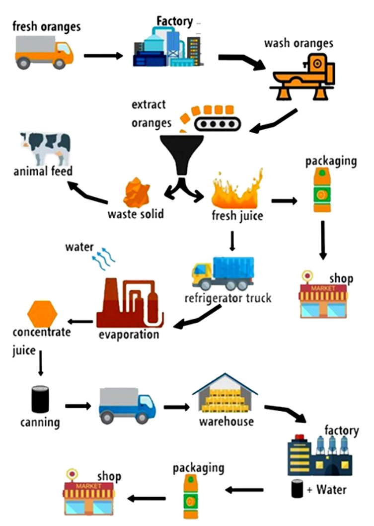 The diagram illustrates the process of producing of orange juice.