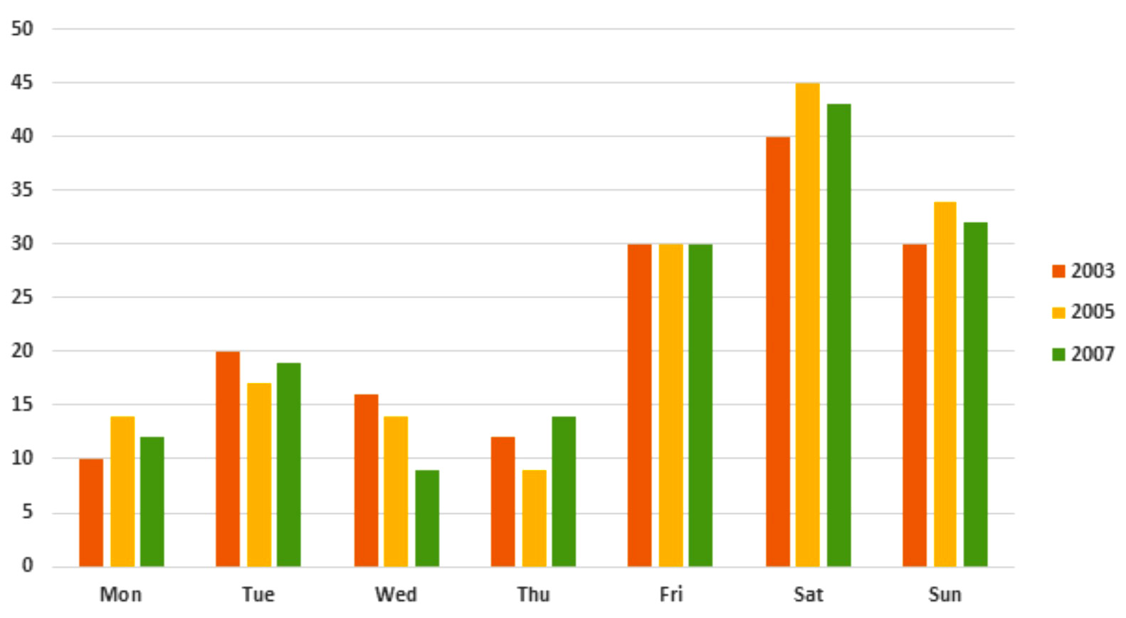 The chart illustrates the proportion of people visiting a cinema during seven days of the week in a European nation from 2003 to 2007.