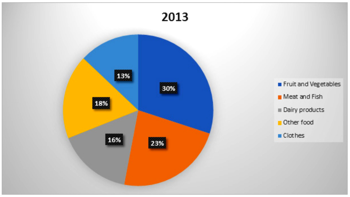 Regarding the pie charts, the percentage for spending on meat and fish was highest among all categories in 2010, at 29%, but three years later experienced a drop to 23%. Similarly, a downward trend was seen in the figure for clothes, from 15% to 13% in 2013. On the other hand, people seemed to spend more money on fruit, vegetables, and dairy products as the figures went up to 30% and 16% respectively. Meanwhile, the proportion of spending on other food remained unchanged at exactly 18%.
