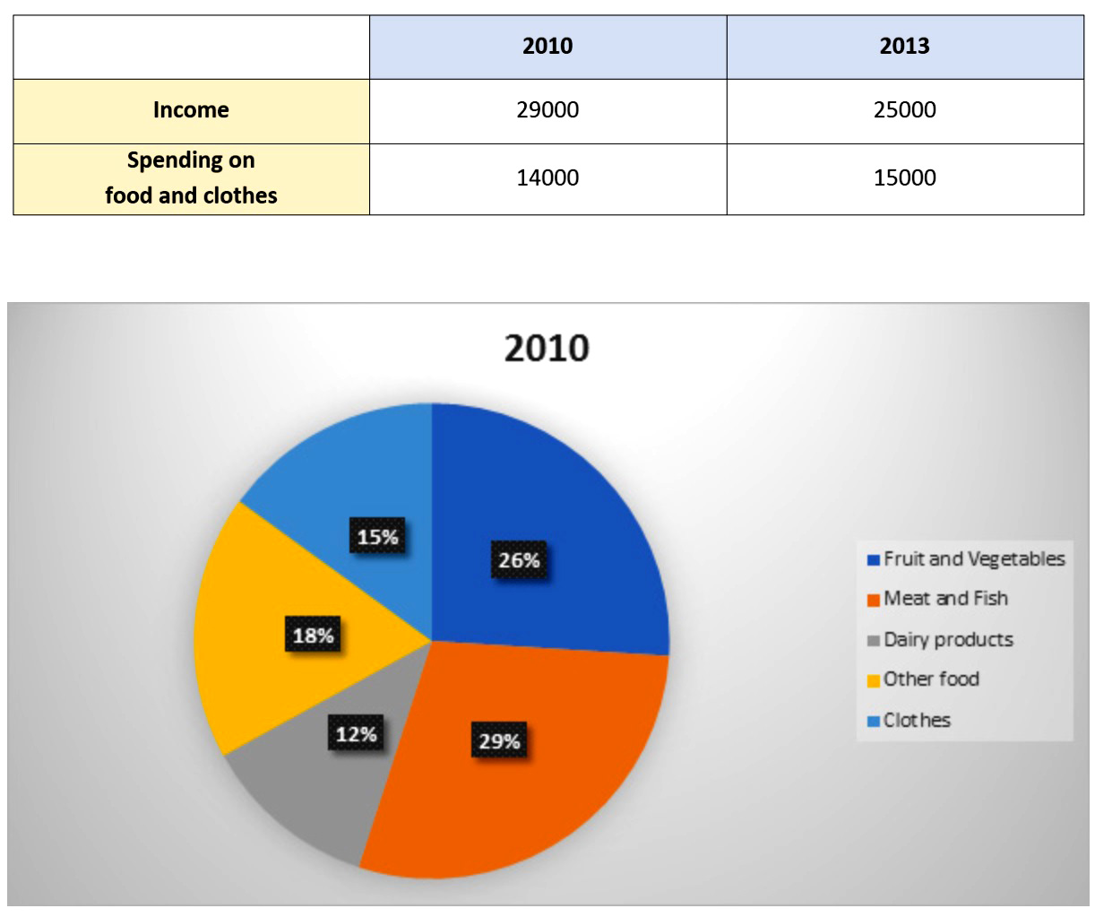 The table illustrates how much money an average family in a UK city earned and paid for food and clothes, while the pie charts represent the proportion of spending on those categories in 2010 and 2013.