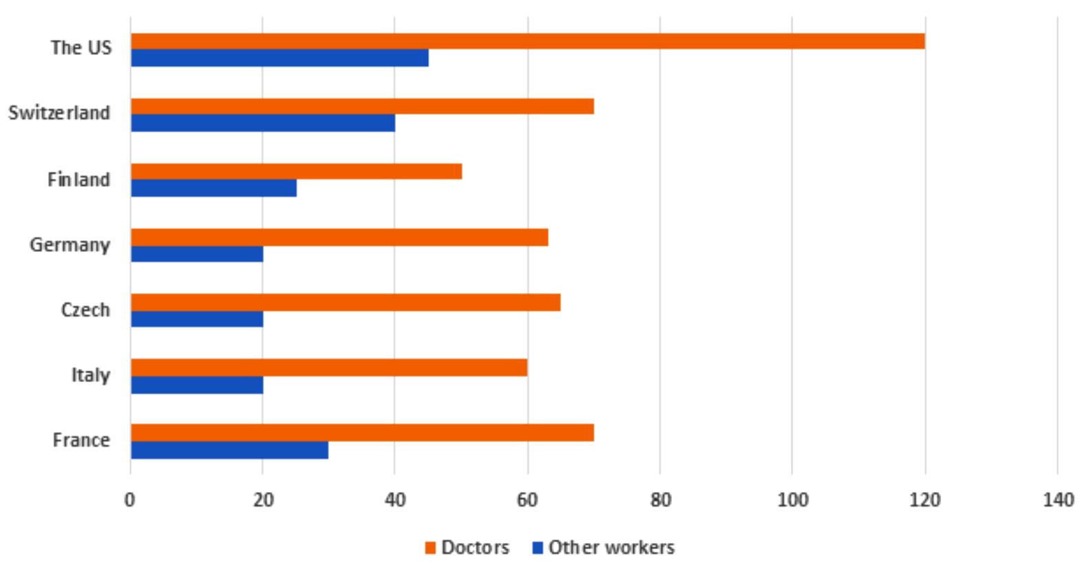 The US doctors earned the largest amount of money compared to those in the other six countries, receiving nearly $120,000, while the figures for Switzerland and France were significantly lower, at close to 70,000 each. In contrast, there was only about $50,000 earned by doctors in Finland, as opposed to doctors in the other countries, who received around $61,000 each.