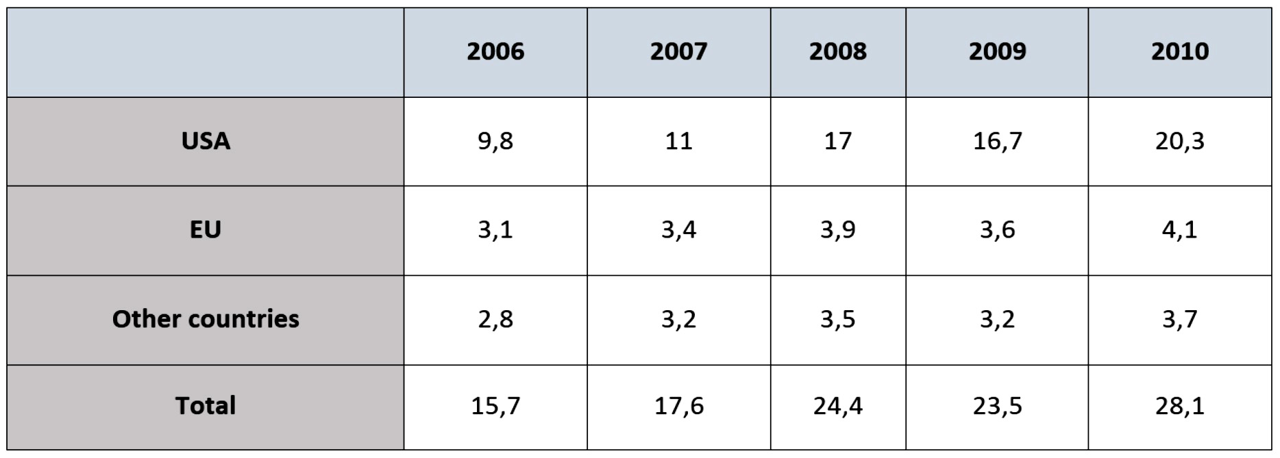 The table illustrates how much money was given to developing countries by the USA, European countries, and other countries, between 2006 and 2010.