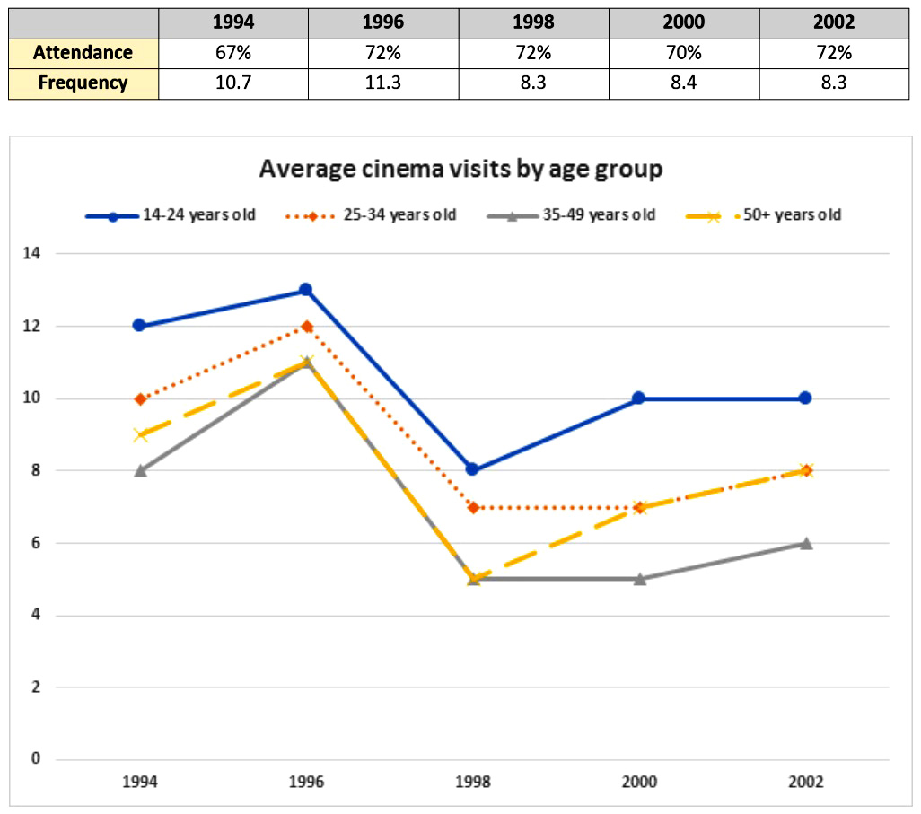 In 1994, about 67% of the total population went to cinema with about 10.7 times a year. This attendance increased to 72% two years later and then remained stable until 2002, despite a fall of 2% from 1998 to 2000. Meanwhile, the average frequency peak at 11.3 times annually in 1996, but then it stabilized at around 8.3 times.
