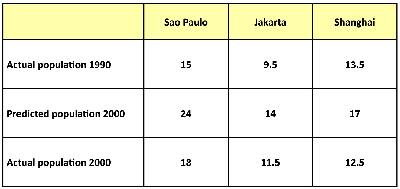 In 1990, Sao Paulo recorded the highest population, at 15 million, followed by Shanghai and Jakarta, with 13.5 million and 9.5 million respectively. Although Sao Paulo’s population was predicted to reach 24 million by 2000, it only rose to 18 million. Similarly, the number of residents in Jakarta increased by 2 million in 2000, to 11.5 million, which was about 2.5 million fewer than forecasted.