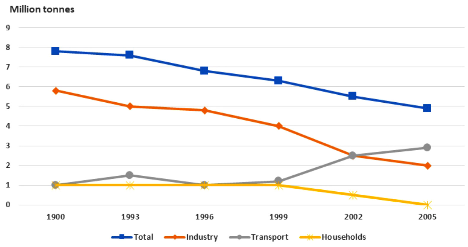 The total number of pollutants discharged into the air gradually reduced over the next fifteen years, with the total figure declining to about 5 million tonnes by 2005. In addition, air pollutants from industrial activity also decreased over time, from just under 6 million tonnes in 1990 to about 2 million tonnes in 2005. Despite the figures for households and transport being equal at the beginning of the period, the quantity of air pollutants from transport saw a small increase to 3 million tonnes by 2005, while air pollutants from households experienced a drop to a negligible amount.