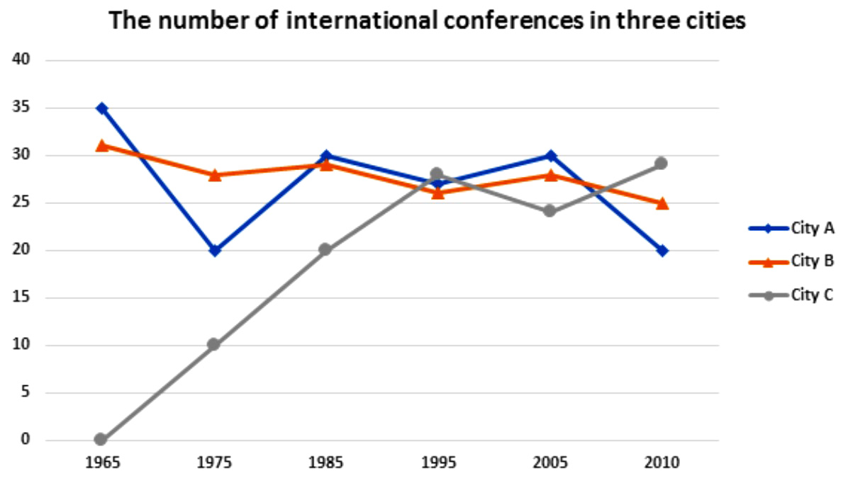 The line graph illustrates the number of international conferences held in three different cites, over a period of thirty-six years, beginning in 1965.
