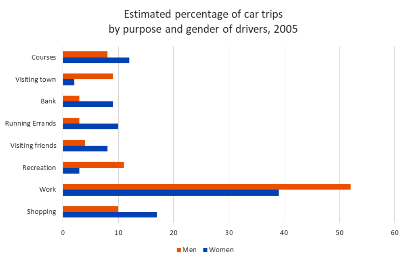 In 2005, 52% of men travelled to work by car, which was about 13% higher than that of women for the same purpose. By contrast, slightly more women than men went on car trips for shopping, with 16% and 10%, respectively. Similarly, the percentages of men and women driving to courses were fairly similar, at 8% and 12% respectively.